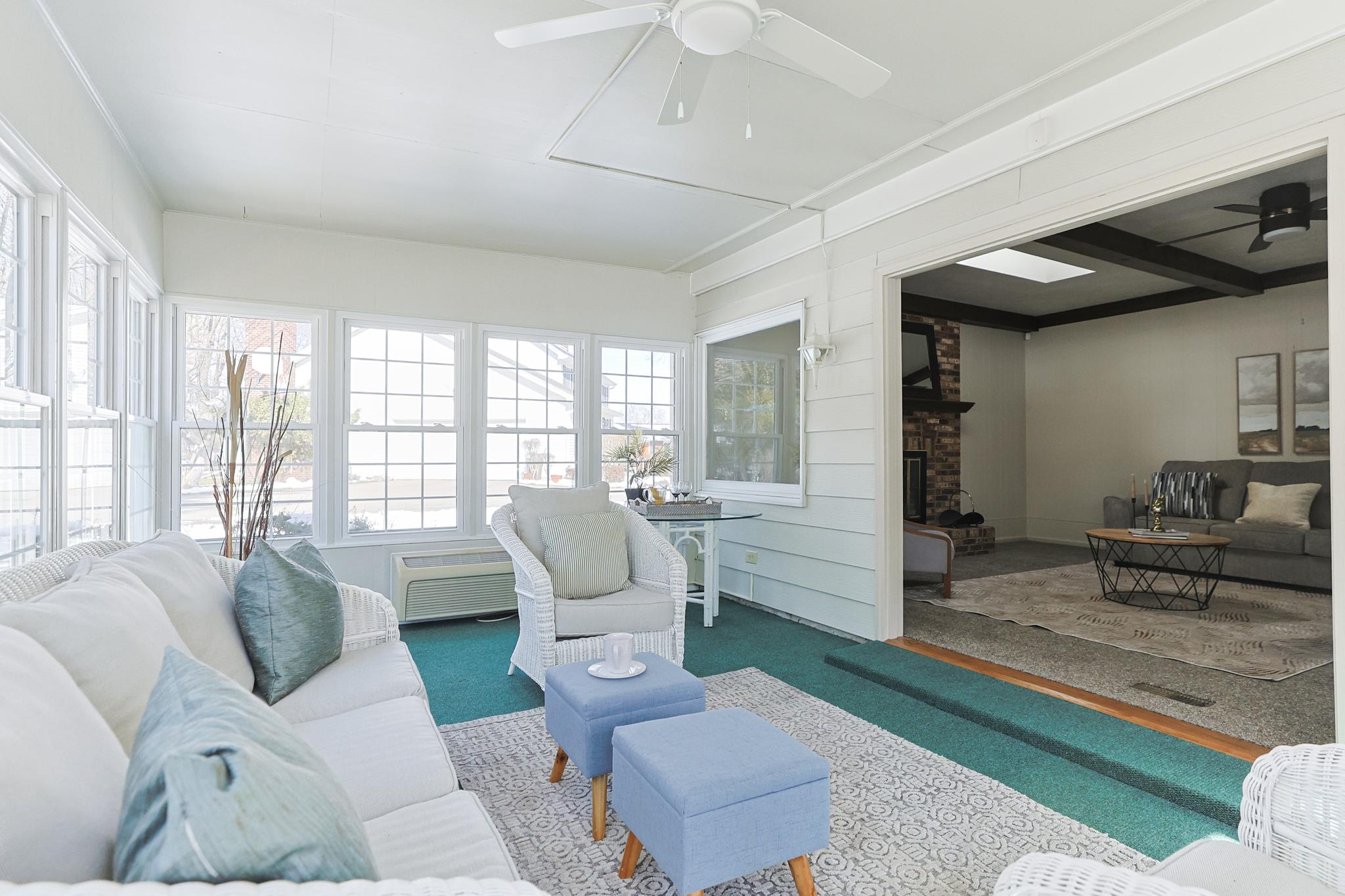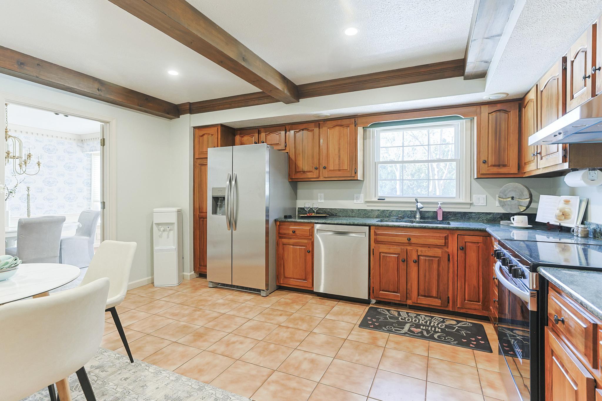 Welcome to your beautifully updated 4 bedroom, 2.5 bath ranch home, perfectly situated in the highly desirable Knollwood community. Enjoy the convenience of being close to the country club and golf course. This home boasts a thoughtful floor plan that includes a formal dining room and a family room featuring charming wood beams. The home is  enhanced by beautiful tile work and unique architectural details throughout. The fully finished basement significantly expands your living area, offering a versatile space, a convenient second set of laundry hook-ups, and a large cedar closet for extra storage. Relax or entertain guests in the sunporch, which offers a lovely extension of the indoor living space. The home features updated bathrooms, new landscaping, and new carpet throughout, alongside newer appliances, ensuring a move-in ready experience. Parking is made easy with a two-car garage, plus an additional golf cart garage—perfect for the golf enthusiast!