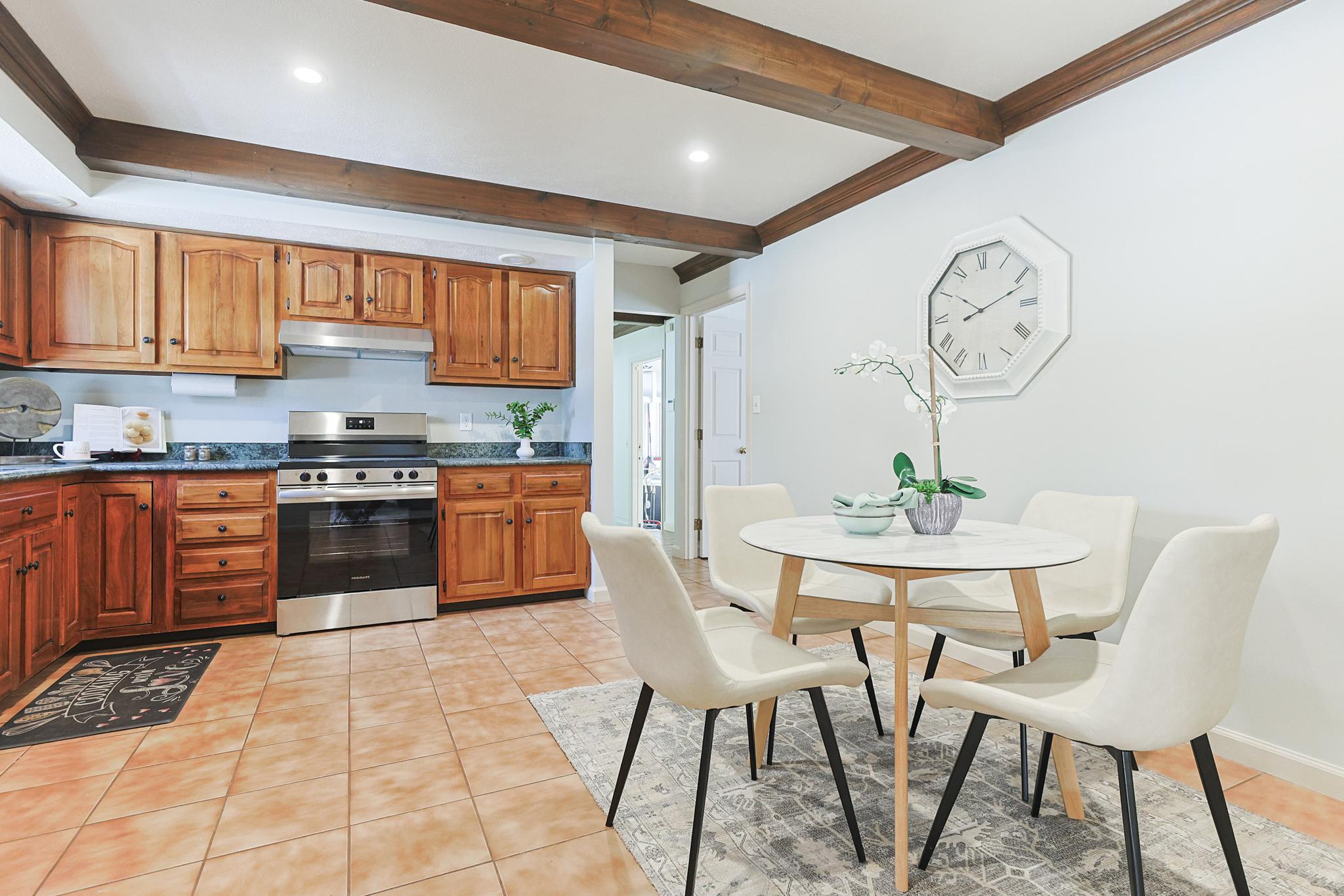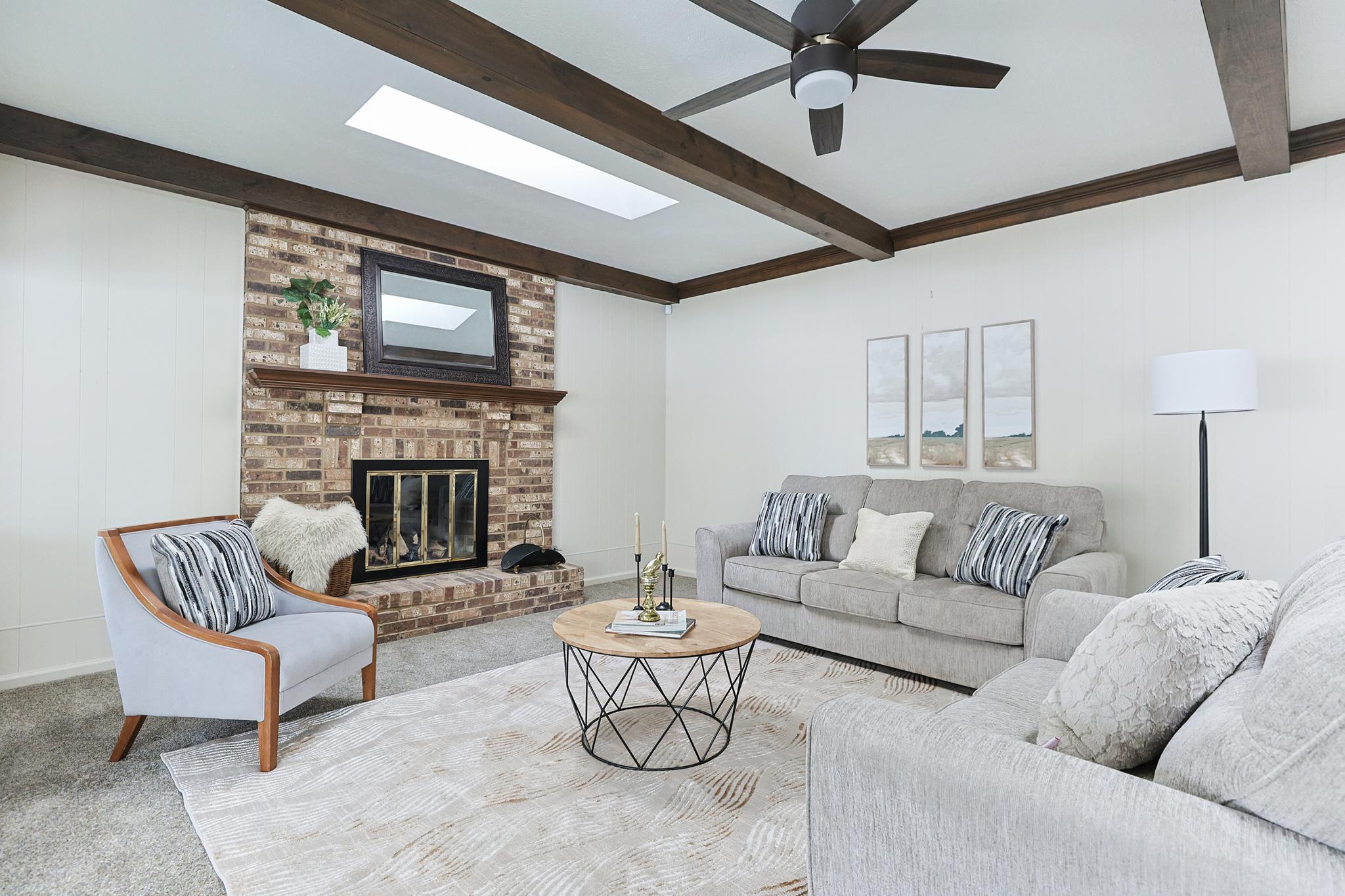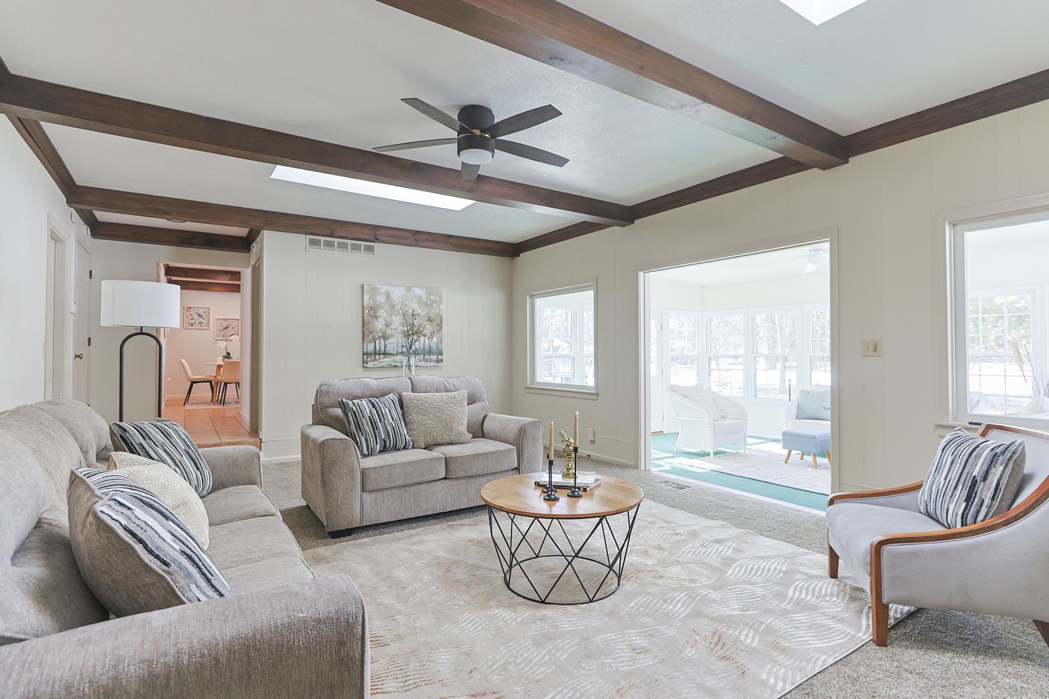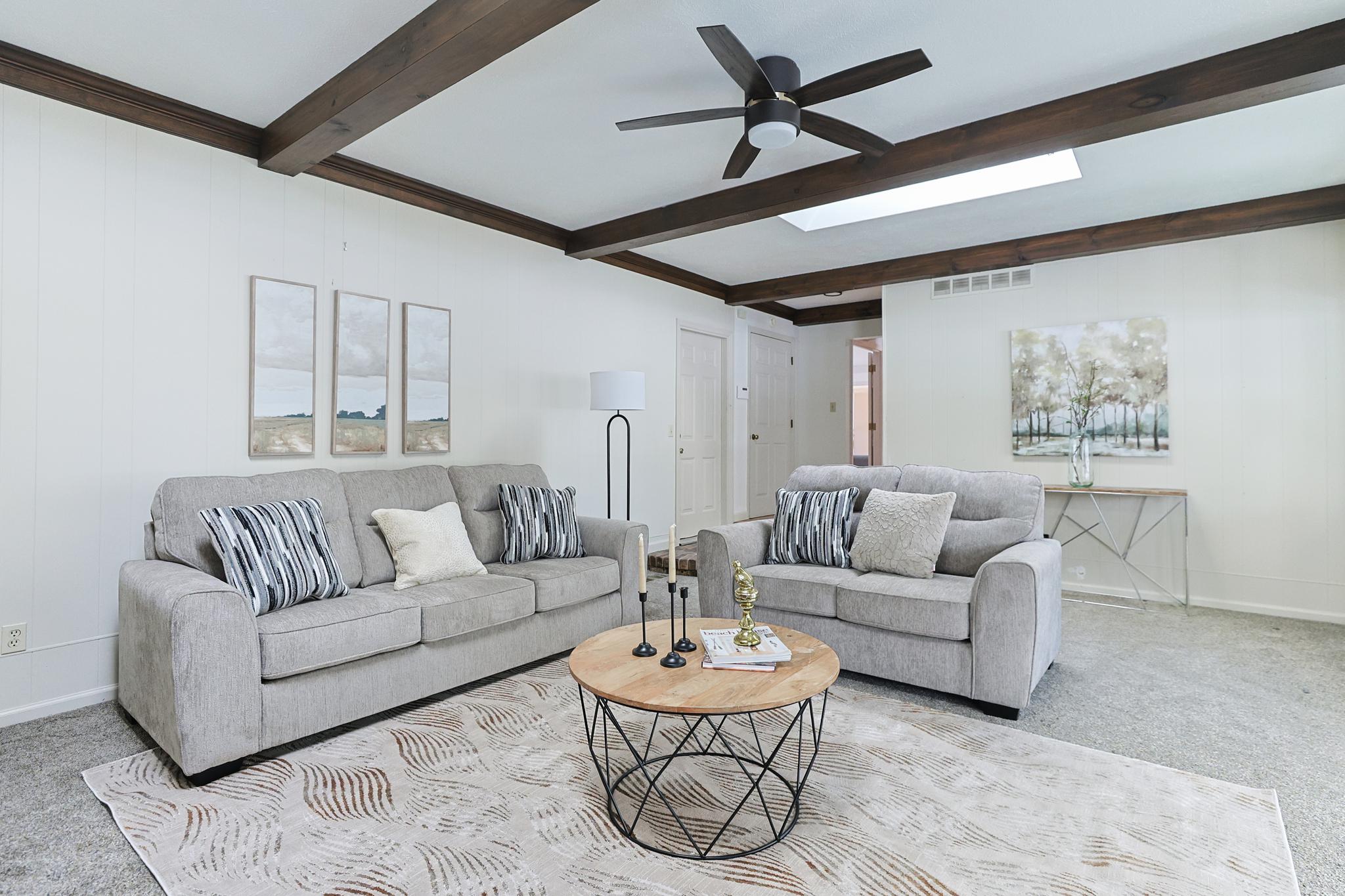 • Family room with charming wood beam details